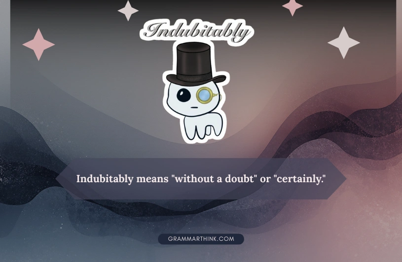 The big picture: Indubitably means “without a doubt,” but it’s fallen out of everyday use. You have alternatives ranging from formal (unquestionably) to casual (for sure) that communicate the same certainty without sounding like you’re auditioning for a Victorian drama.