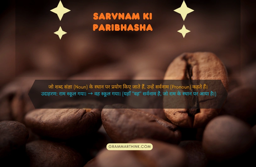 सर्वनाम वे शब्द हैं जो संज्ञा की जगह इस्तेमाल होते हैं। जैसे “राम खेलता है” की जगह हम “वह खेलता है” कहते हैं यहाँ “वह” सर्वनाम है। Sarvnam Ki Paribhasha के अनुसार इसके 6 भेद होते हैं और यह हर वाक्य को दोहराव से बचाता है।
